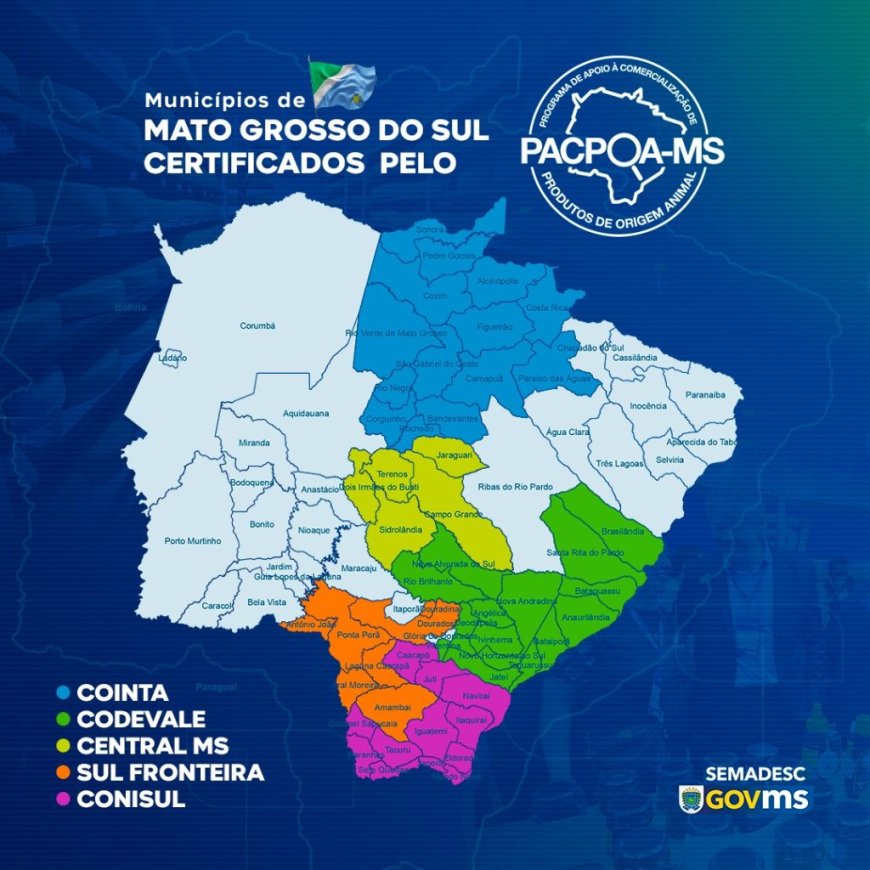 Quatorze municípios que compõem do Conisul (Consórcio Intermunicipal de Desenvolvimento da Região Sul do Mato Grosso do Sul) receberam hoje (29) o certificado do Pacpoa-MS (Programa de Apoio à Comercialização de Produtos de Origem Animal de Mato Grosso do Sul).
