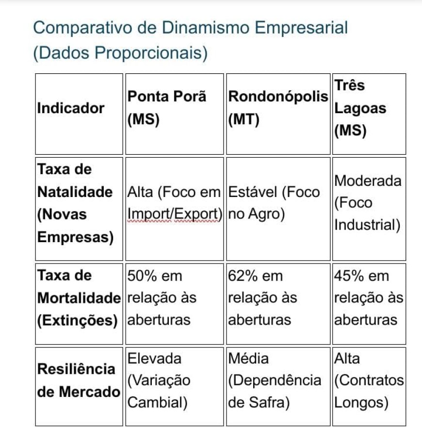 Enquanto capitais como Campo Grande e Cuiabá mantêm números absolutos superiores devido à densidade populacional, o desempenho de Ponta Porã em 2025 revela uma eficiência proporcional notável. Em cidades de médio porte do interior do Mato Grosso do Sul, a média de sobrevivência empresarial costuma ser mais volátil, tornando o índice de 2 aberturas para cada 1 fechamento em Ponta Porã um indicador de estabilidade superior ao de vizinhas como Dourados, que enfrentaram oscilações maiores no setor de serviços.