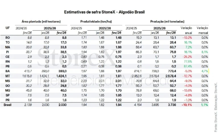 A StoneX revisou para cima a estimativa de oferta total de algodão do Brasil para 3,74 milhões de toneladas em 2026, após a conclusão do plantio nas principais regiões produtoras.