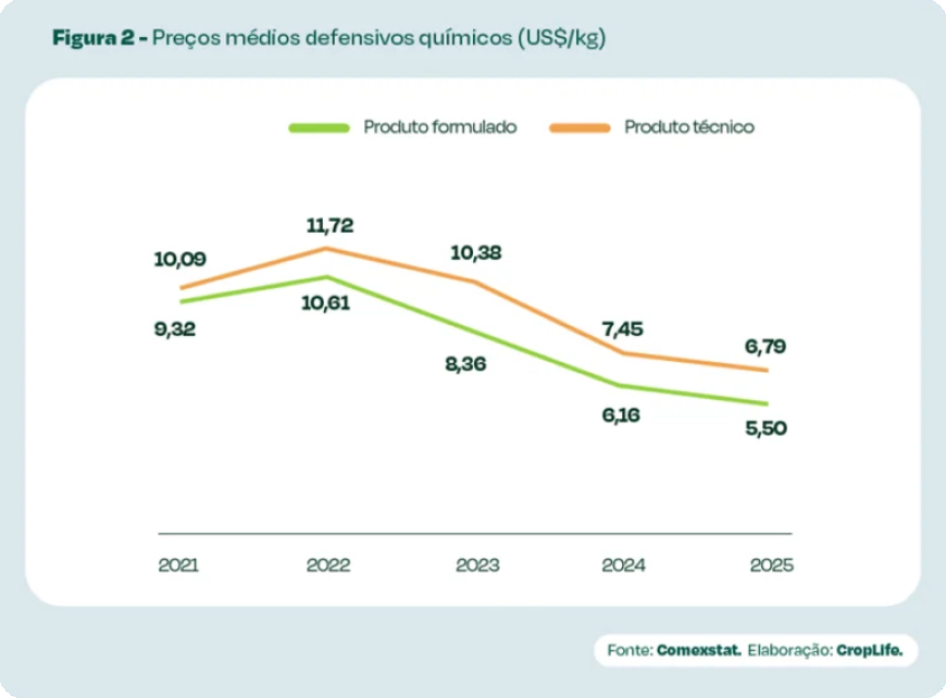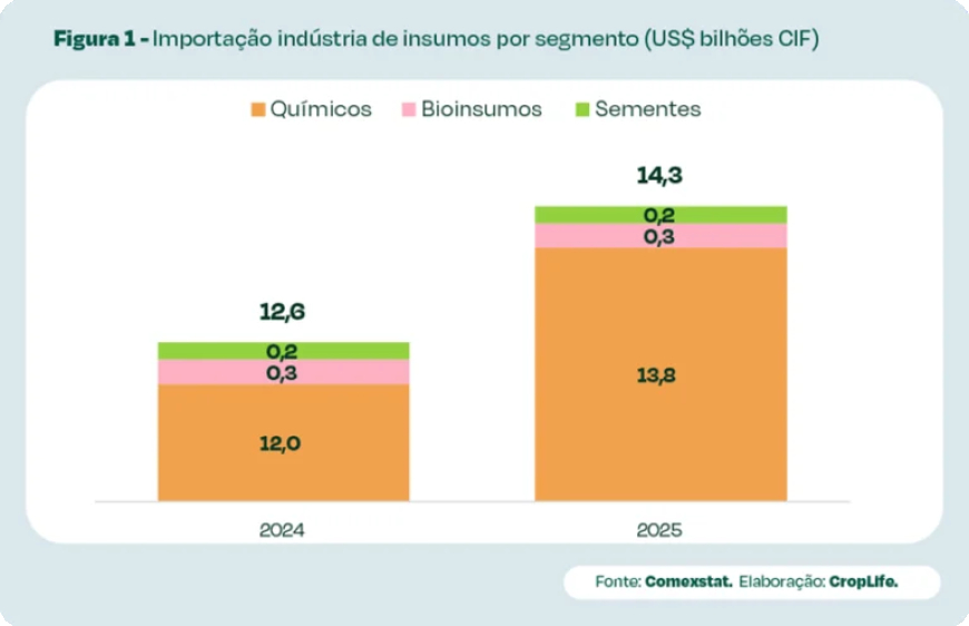 Quando se observa o valor importado em 2025, o destaque está nos defensivos químicos (96,3%), seguido por biológicos (2,2%) e sementes (1,5%).