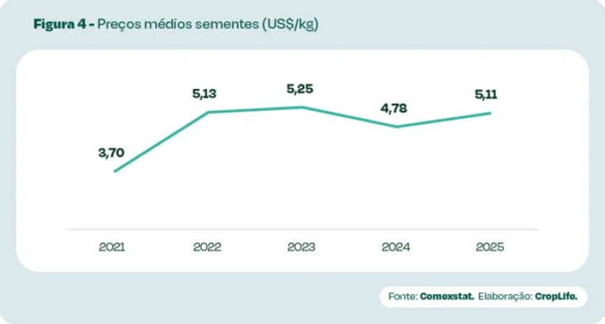 Maria Xavier pontua que o alto desempenho é resultado da valorização dos preços médios dos grãos exportados do Brasil, uma vez que o volume de sementes vendidas teve breve retração (1,1 mil), em comparação a 2024.