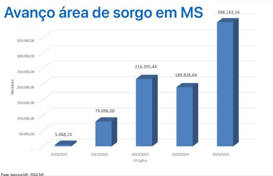 O avanço rápido do sorgo na segunda safra em Mato Grosso do Sul mostra que a cultura deixou de ser apenas uma alternativa para momentos de aperto e passou a integrar, de forma planejada, as decisões econômicas do produtor rural. Em apenas cinco safras, a área cultivada no Estado saiu de pouco mais de 5 mil hectares para perto de 400 mil hectares, um crescimento superior a 7.700%, conforme os levantamentos do SIGA (Sistema de Informações Geográficas do Agronegócio), ferramenta gerida pelo Governo do Estado, por meio da Semadesc em parceria com a Aprosoja.